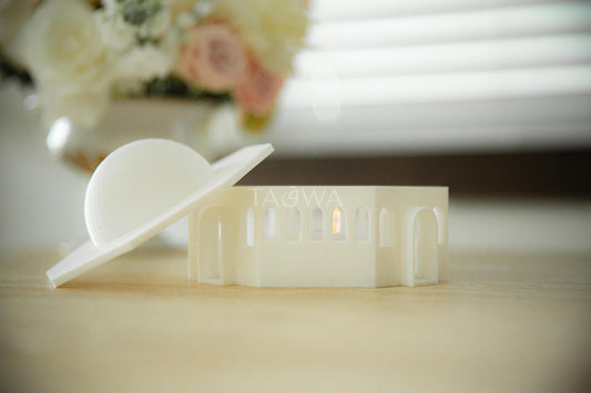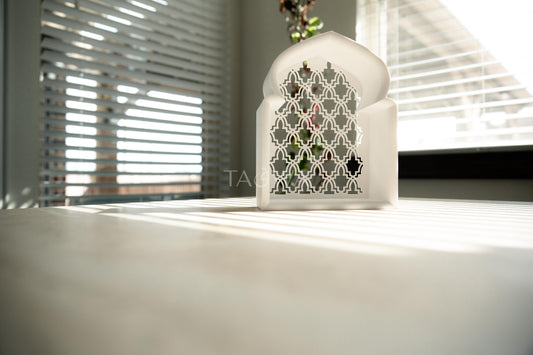 Trellis Oasis Lantern | Modern Mini Masjid Lantern with Dome and Minaret Lid | Ramadan Decor | Simplistic Islamic Home Decor | White & Gold